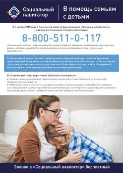 В Пензенской области действует круглосуточный центр приема обращений семей с детьми В рамках проекта «Социальный навигатор», инициированном Уполномоченным при Президенте РФ по правам ребенка Анной Кузнецовой, в Пензенской области создан центр приема обращений семей с детьми. Основная цель проекта – повышение эффективности работы по защите прав и законных интересов несовершеннолетних.