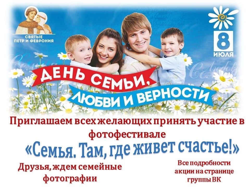 8 июля в России отмечается День семьи, любви и верности. В честь этого события был запущен Фотофестиваль «Семья. Там, где живет счастье!».